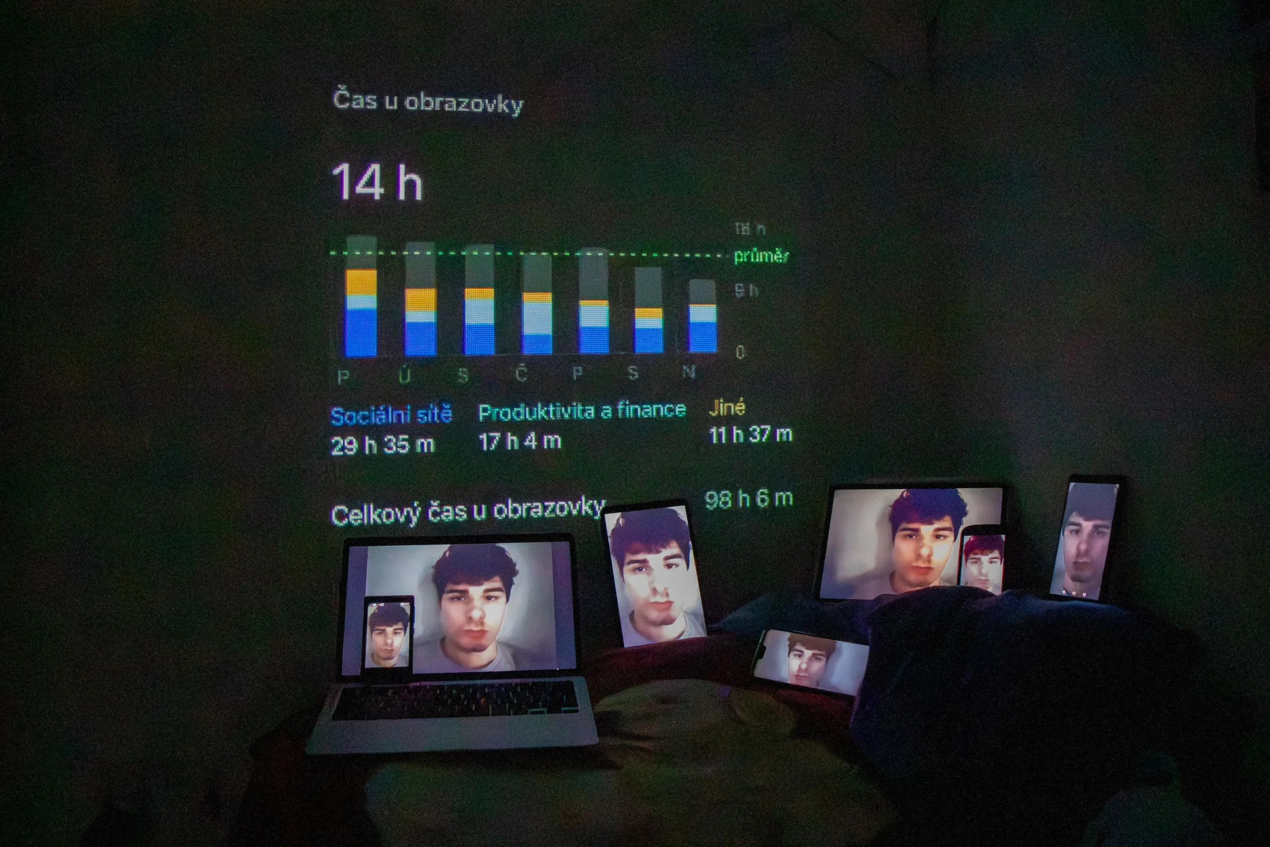 Autoportrét o vztahu k sociálním sítím a jejich vlivu na každodenní život.